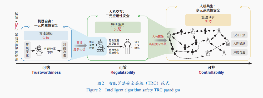 智能算法3个层级关注的安全风险类型和产生原因不同:一元场景中关注由算法内生缺陷导致算法性能不可信,二元场景中关注由算法应用中的滥用误用导致算法服务不可管,多元场景中关注由人机算法博弈对抗导致系统演变不可控。智能算法安全的目标是实现智能算法一元内生决策可信(trustworthiness)、二元服务应用可管(regulatability)、多元系统风险可控(controllability),即智能算法安全层级范式(以下简称“TRC范式”)(图2)。