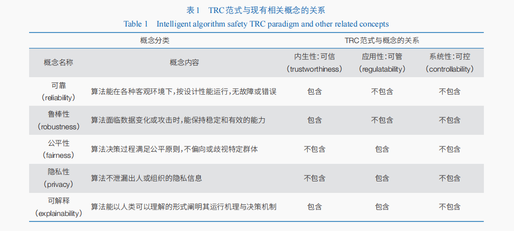 TRC范式可以涵盖已有的相关概念(表1)。可信算法与TRC范式的关系:智能算法的可信性一般指算法能被用户或社会认为是可信赖的、可依赖的,包括算法的鲁棒性、公平性、可解释性、隐私性、可审计性等,其定义包含于TRC范式之中。 负责任算法与TRC范式的关系:智能算法的负责任性一般指算法的行为符合道德、法律要求,避免对人类、环境或社会造成危害或不良影响,其定义包含于TRC范式之中。TRC范式中的系统性:现有相关概念仅适用于描述算法本身,故不适用于系统性安全层面。