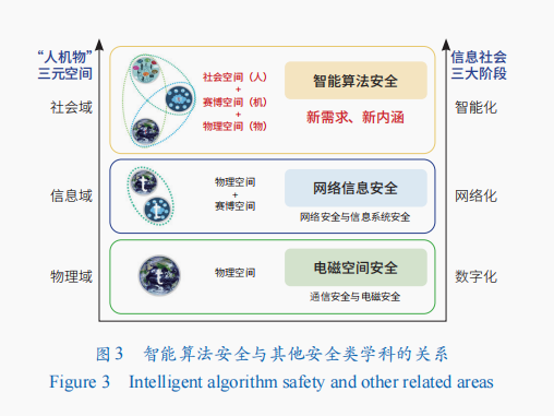 智能算法安全是涉及社会域安全的一门新兴学科,与其他安全类学科有一定的联系(图3)。在数字化早期阶段,物理世界数字化是主体任务,物理电磁空间安全是关键,着重解决通信安全、电磁安全与频谱控制等难题;随着互联网的发展,人机互联推动信息域与物理域融合,网络与信息安全问题凸显,网络安全与信息系统安全成为重点。当前社会已经进入智能化时代,万物互联,“物理—信息—社会”三元空间融合,算法成为影响智能社会运行的核心引擎之一,智能算法安全成为新的安全挑战。这种挑战的出现是信息社会发展演进的必然结果,不同于以往主要关注物理域和信息域的物理安全以及网络信息安全,智能算法安全的关注点更加聚焦于由智能算法带来的社会域问题,需要重新审视和构建安全保障的策略和措施。